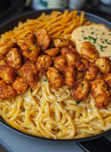 Pikantne Czosnkowe Kawałki Kurczaka z Kremowym Makaronem Fettuccine i Parmezanem to uczta dla zmysłów, łącząca intensywny smak z aksamitną teksturą.