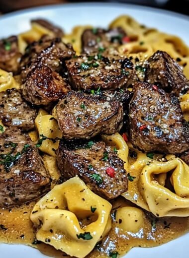 Kawałki steku z tortellini w sosie kowbojskim z jednej patelni zachwycają intensywnym smakiem i perfekcyjną teksturą, idealne na rodzinny obiad.