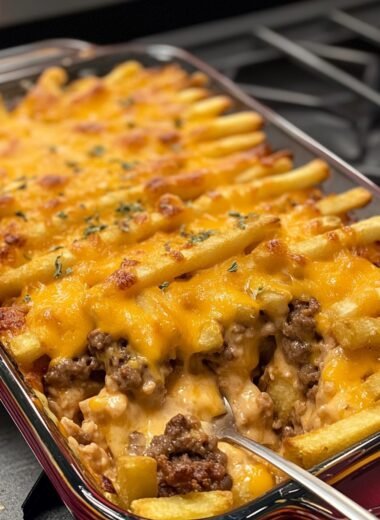 Szalona zapiekanka cheeseburger z frytkami łączy soczyste mięso, topiony ser i chrupiące frytki w jednej wyjątkowej potrawie, idealnej na każdą okazję.
