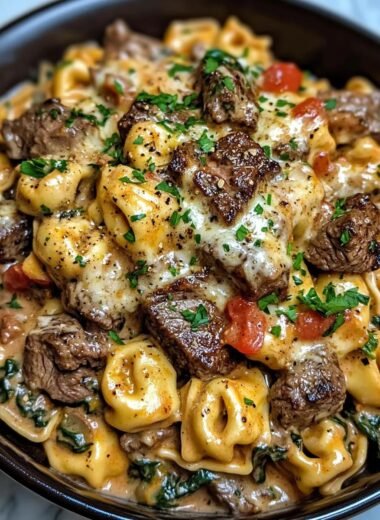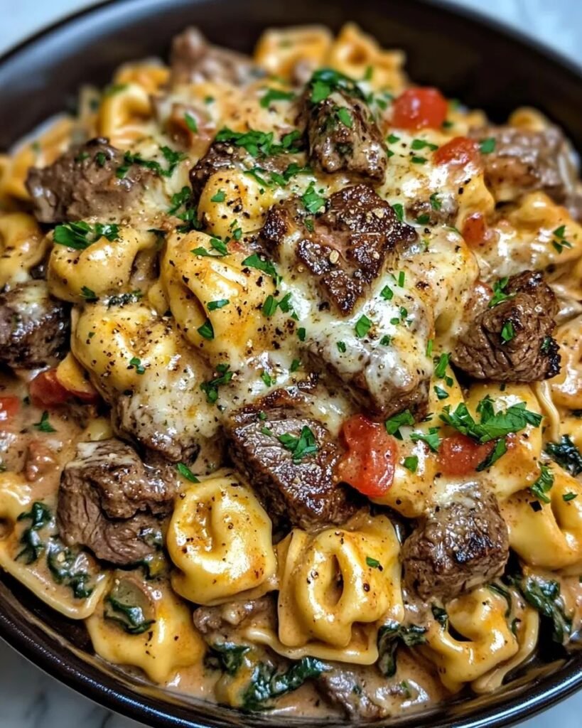 Soczyste kawałki steku w połączeniu z kremowym sosem i świeżym szpinakiem tworzą niezapomniane Kremowe toskańskie tortellini ze szpinakiem i kawałkami steku, i…