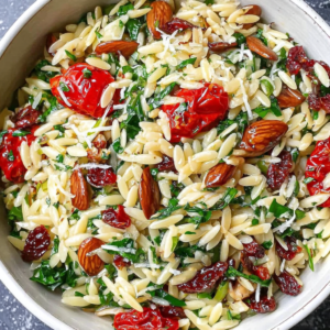 - Pour the dressing over the orzo salad and toss to combine evenly.