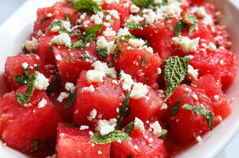 The juicy, hydrating watermelon forms the base of the salad, offering a cooling sensation on warm days. Crumbled feta adds creaminess and a salty contrast, while fresh mint brings an aromatic freshness that elevates the entire dish. Together, these ingredients create a symphony of flavors that delights the palate.